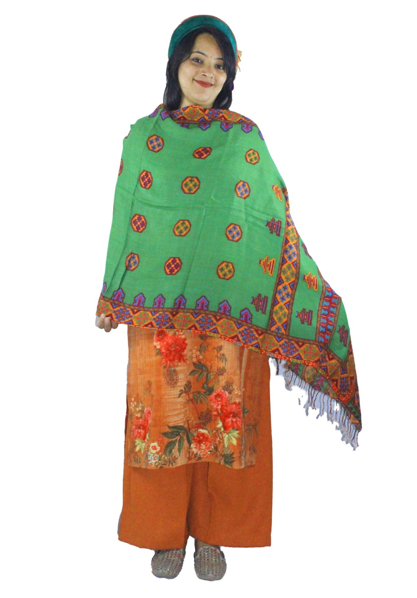 PURE WOOL STOLE WITH BEAUTIFUL KULLU KINNAURI PRINTED DESIGN green