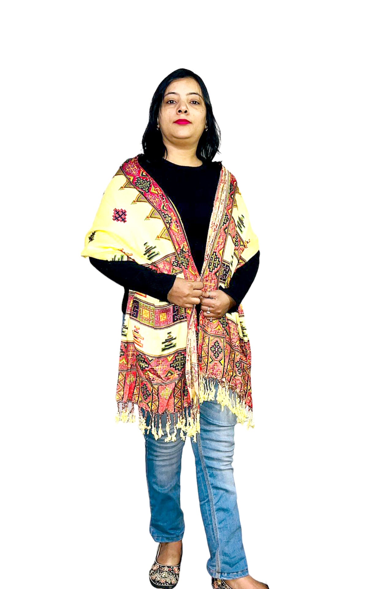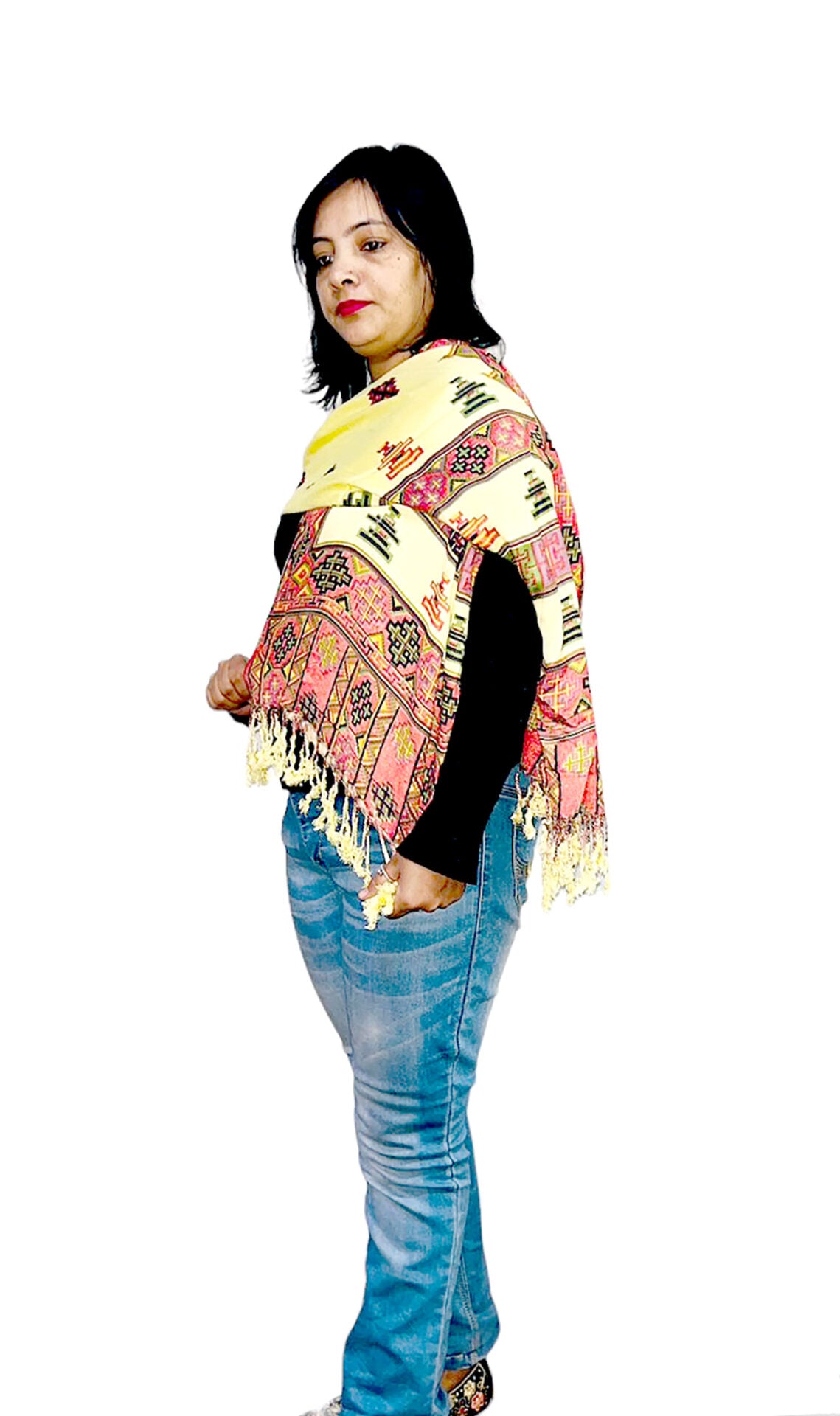 kullu manali famous items PURE WOOL STOLE WITH BEAUTIFUL KULLU KINNAURI PRINTED DESIGN LEMON